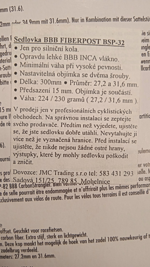 Sedlovka BBB BSP-32 FiberPost II 300mm určena jen pro silniční kola. Opravdu lehké BBB INCA karbonové vlákno. Minimální váha při vysoké pevnosti a značné odolnosti. Nízkoprofilová lehká sedlovka. Nastavitelný podsedlový zámek se dvěma šrouby. Předsazení 15 mm. Váha: 224 gramů (27.2 mm), 230 gramů (31.6 mm). Objímka CarbonStrangler (BSP-82) je součástí.